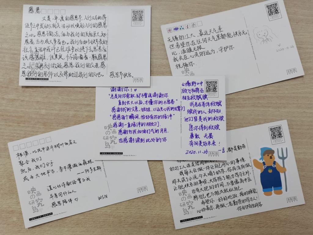 诗人约翰多恩曾说:“没有人是一座孤岛,在大海中独踞。”人是社会的动物,个人的成长发展离不开与身边人建立联结,正是身边的人们使个人成为现在的自己。同学们应当心怀感恩,坚定前行,感谢身边每一个为自己负重前行的人。此次感恩节明信片活动的开展,使一张张明信片成为架起心灵的桥梁,感恩不再是一件羞于表达的事,食品学子们在这个凛冬切实感受到星火般的温暖。