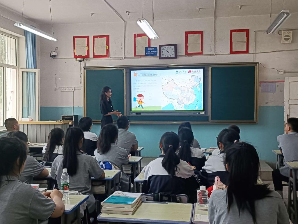 在喀什地区莎车县第七中学,实践团从中国传统文化中找寻灵感,本着因地制宜、分类指导的原则,开展独具特色的乡村推普活动。实践团为当地的青少年儿童带去国语、数学、音乐、食育等课程,以教促学、以学促推。通过《出塞》《使至塞上》等歌颂新疆的经典诗词帮助孩子们掌握汉字的正确书写方法和语言风格。通过《勾股定理》的学习助其了解古代图形分析和推理方法之妙,促使广大青少年主动在中华民族优秀传统文化中汲取养分,在教学相长中让普通话入脑入心。