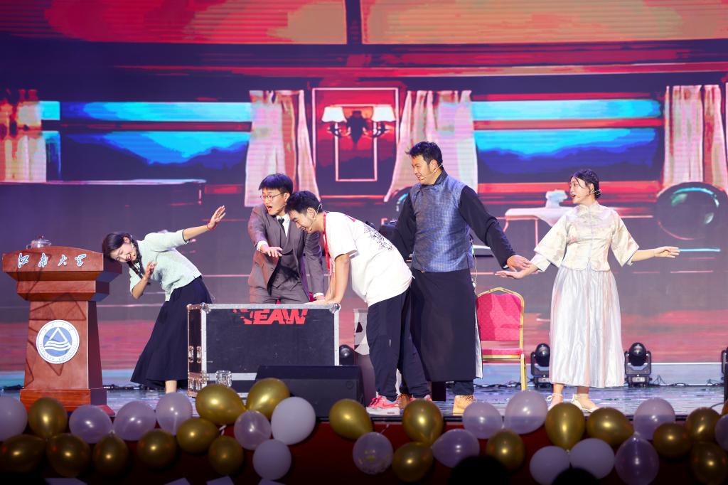 2024级新生合唱团带来的《请党放心,强国有我》真挚而嘹亮,展示了当代青年的风采与担当。一首独唱《梨花又开放》让观众们忆及年少时的欢笑与泪水。学生会同学演唱的歌曲串烧《小镇·夏天·朋友》带大家重温经典,赢得掌声连连。