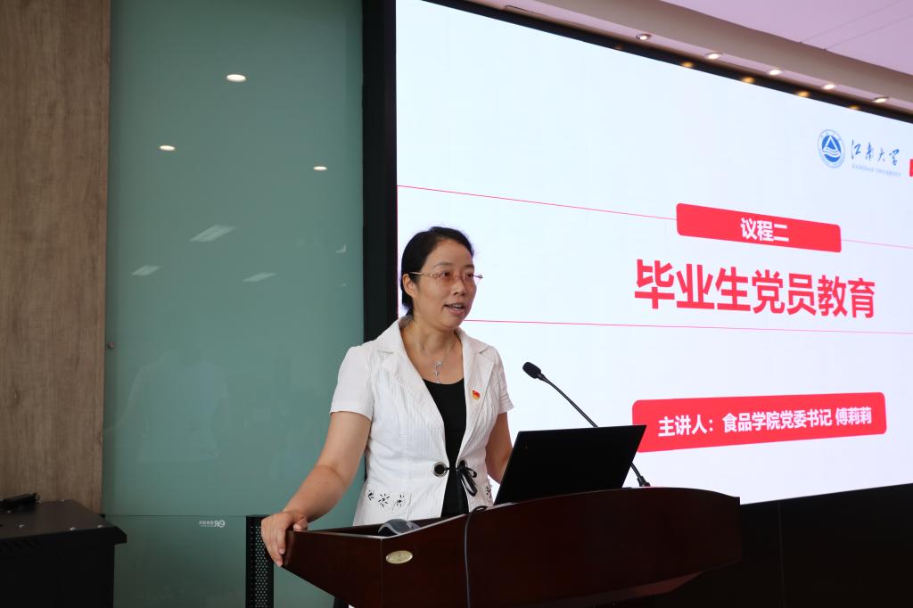 首先,傅莉莉书记做毕业生党员离校教育。她指出,共产党员是一个光荣的称号,更是一份责任与使命,希望大家始终发挥党员先锋模范带头作用,并提出三点期望。一是不忘初心、牢记使命。希望大家提高政治意识、学会常寻初心、加强思想学习、注重实践积累,永葆共产党人的初心。二是恪守正道,敢于创新。既要遵守党规党纪、法律法规、规章制度,又要恪守专业之道。在此基础上,善于发现勇于创新,将所学服务于国家需要,推动中国食品行业的发展。三是勤勉有为,展现风采。希望大家始终铭记“勤业、创新、争先、共赢”的院训,将在江南大学学到的知识、培养的能力、养成的品格,淋漓尽致地展现出来,以赢得工作单位对于食品学子的认可,让社会各界为江南大学点赞。