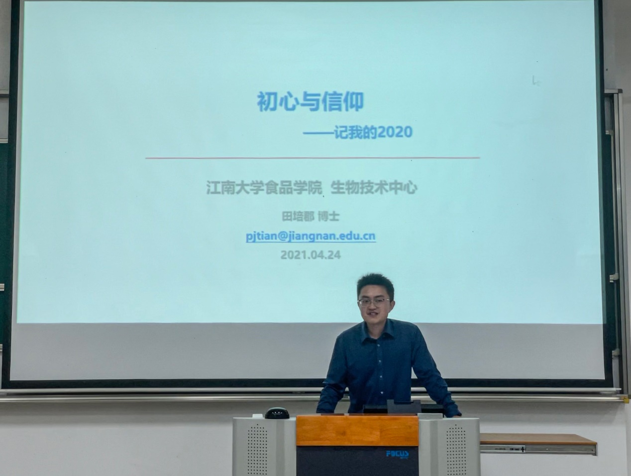 田培郡作为江南大学与爱尔兰科克大学联合培养博士,疫情期间身在国外,积极向国外朋友介绍中国防疫的有效举措,帮助他们理解中国,正确评价中国。同时,还组织动员江大益生菌团队向其所在的爱尔兰John Cryan教授团队捐赠1000只防疫口罩,传递中国温度,体现了青年党员的初心与信仰、情怀与担当。田培郡围绕“中国战‘疫’”、“四个自信”、“人类命运共同体”、“共产主义接班人”、“中国梦”五个关键词以其国外亲身经历讲述了身为共产党人对初心与信仰的理解:抗疫大考中彰显的中国速度、中国精神与中国力量震惊世界,体现了在中国共产党领导下我国集中力量办大事的制度优势。中国战“疫”取得成功更加坚定了对“四个自信”的理解和把握。在疫情大考面前,中国和受疫情影响的世界各国风雨同舟、命运与共,为全球疫情防控贡献重要力量,生动诠释了为世界谋大同、推动构建人类命运共同体的大国担当。作为共产主义接班人的青年一代,当以报效国家为己任,以服务人民为荣光,接好历史的接力棒,为实现中华民族伟大复兴中国梦而努力奋斗。