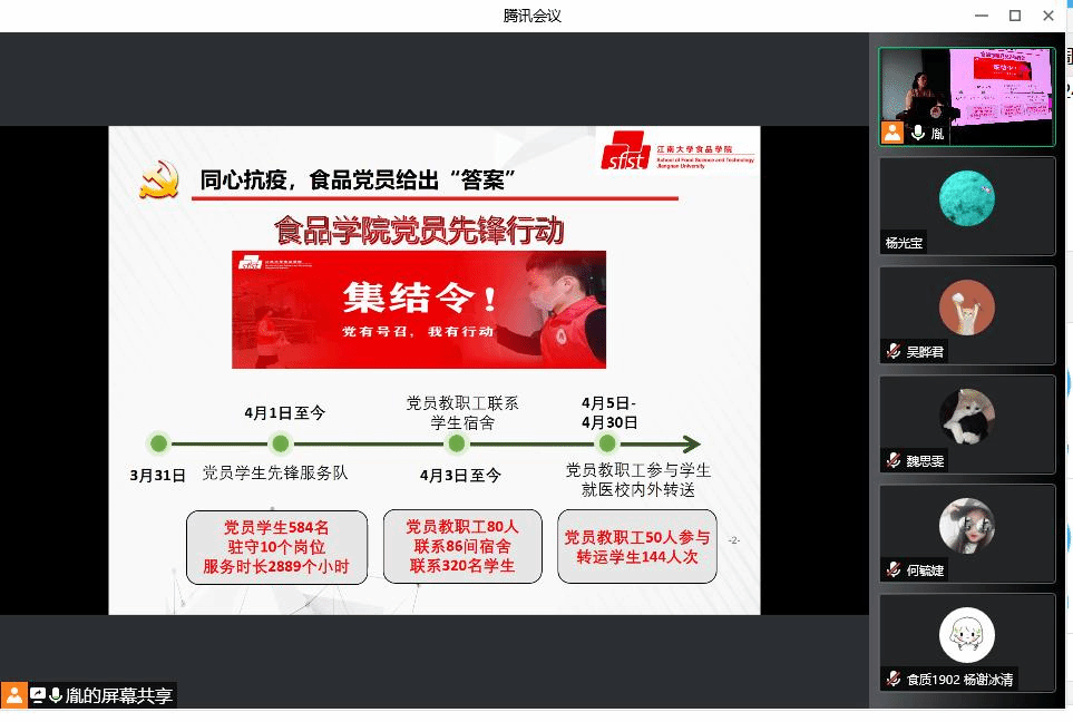 党委书记傅莉莉首先对4月以来师生党员在疫情防控工作中勇于亮身份、当先锋、做表率,以多种方式积极发挥作用的表现给予充分肯定,并对近期党支部工作进行了部署,对下一步党建工作规范化提出了要求。