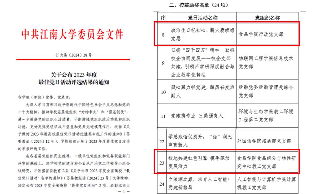 行政党支部、食品组分与物性研究中心教工党支部获江南大学最佳党日活动鼓励奖。