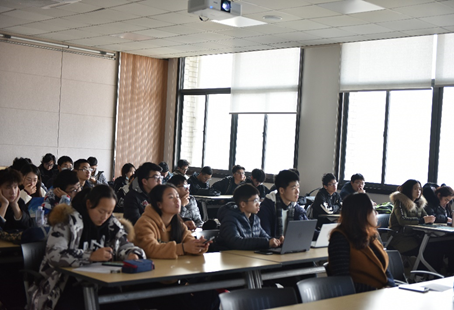 副院长谢云飞主持报告,中外合作办学班全体同学参加,本次讲座吸引了近60名学生到场聆听。
