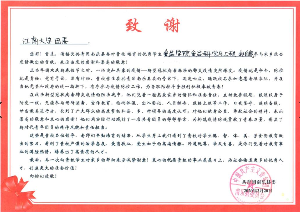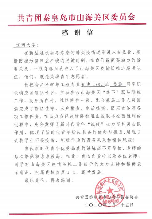 大三学生赵自宽和博一学生姜旋收到2封感谢信,分别来自濮阳市南乐团县委和秦皇岛市山海关团区委。感谢信中表彰了他们在家乡积极响应号召,勇于担当奉献,踊跃参与疫情防控工作的事迹。