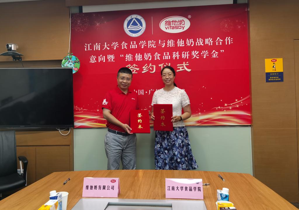 单位书记傅莉莉与维他奶首席执行官钟廷毅进行了“维他奶食品科研奖学金”签约,并由奖学金项目为起点,双方达成了战略合作意向,积极构架校企产、学、研合作的平台,以支持国内植物基食品行业的科研、开发和食品生产实践探索。