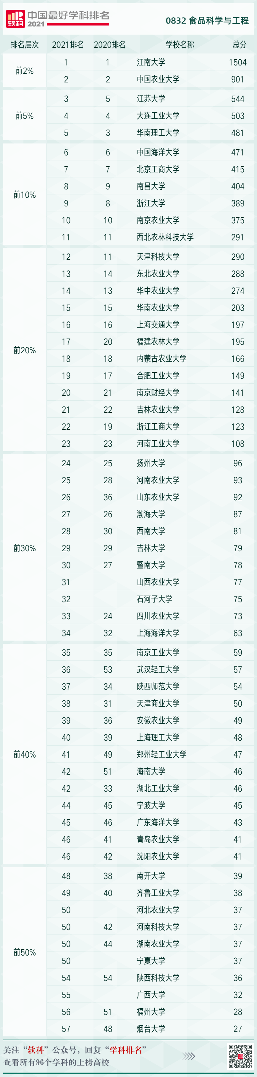 据悉,软科中国最好学科中“食品科学与工程学科”的指标体系包括人才培养、科研项目、成果获奖、学术论文、学术人才五个指标类别,下设13个指标维度,总计量化积分1650分。最新排名中,江南大学以1504分位居榜首。完整排名名单如下: