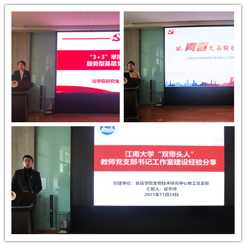随后,我校第一批高校“双带头人”教师党支部书记工作室、江苏省特色党支部食品生物技术研究中心教工党支部书记翟齐啸,“全国研究生标杆党支部”生物工程学院生物系统与生物加工工程研究室党支部书记张海云,“全国第二批标杆党支部”法学院研究生第一党支部书记丛毅竹先后进行了交流发言,介绍了党支部在创建工作的做法和经验,起到交流借鉴、比学赶超的积极作用。