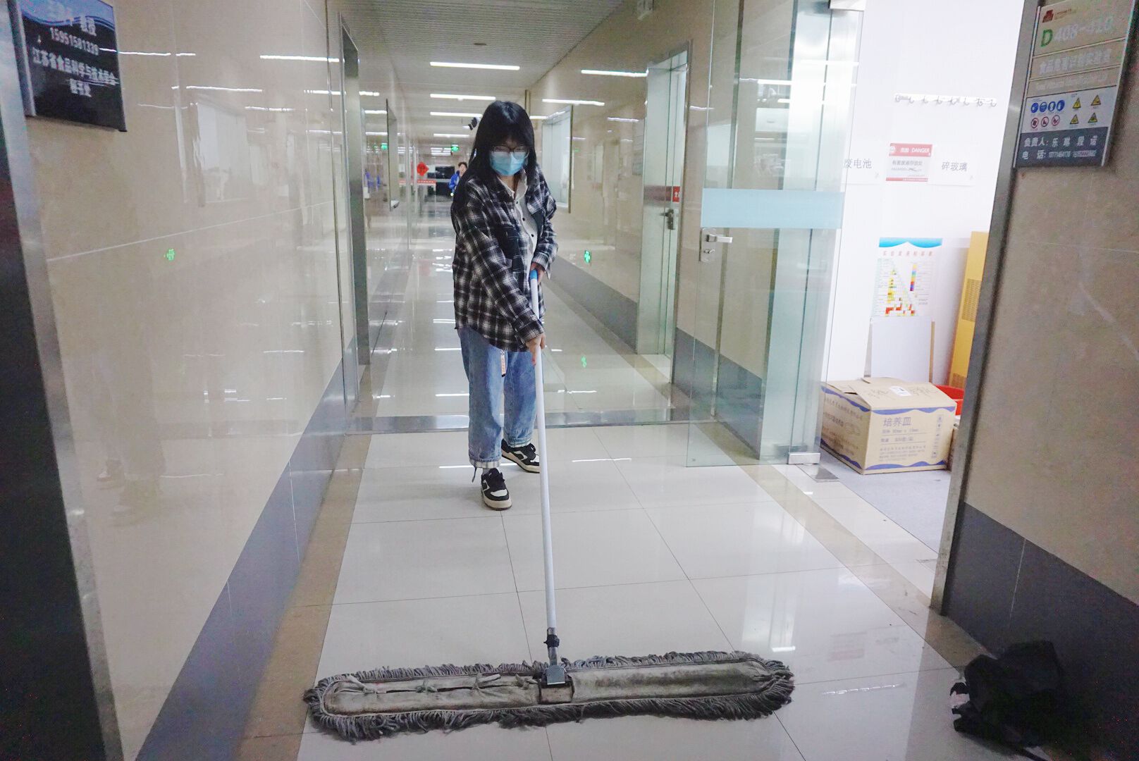 “以实际行动为抗击疫情、服务师生做贡献,我们请求出战!”党员们两人为一组共同负责一至五层楼的走廊卫生,从最初轻松提起推尘器,到后来用尽手腕力气才能勉强将其拖拽,两个钟头一刻也不停歇,徐敏坦言,“我知道扫地拖地很辛苦,但没想到自己会狼狈到喘不匀气、挺不起背,愈发佩服每日早出晚归活跃在走廊拐角处的环境卫士们了。”当听到同学们惊讶地谈论原先灰蒙蒙的地面变得焕然一新,她就会挺直腰,满满幸福感。