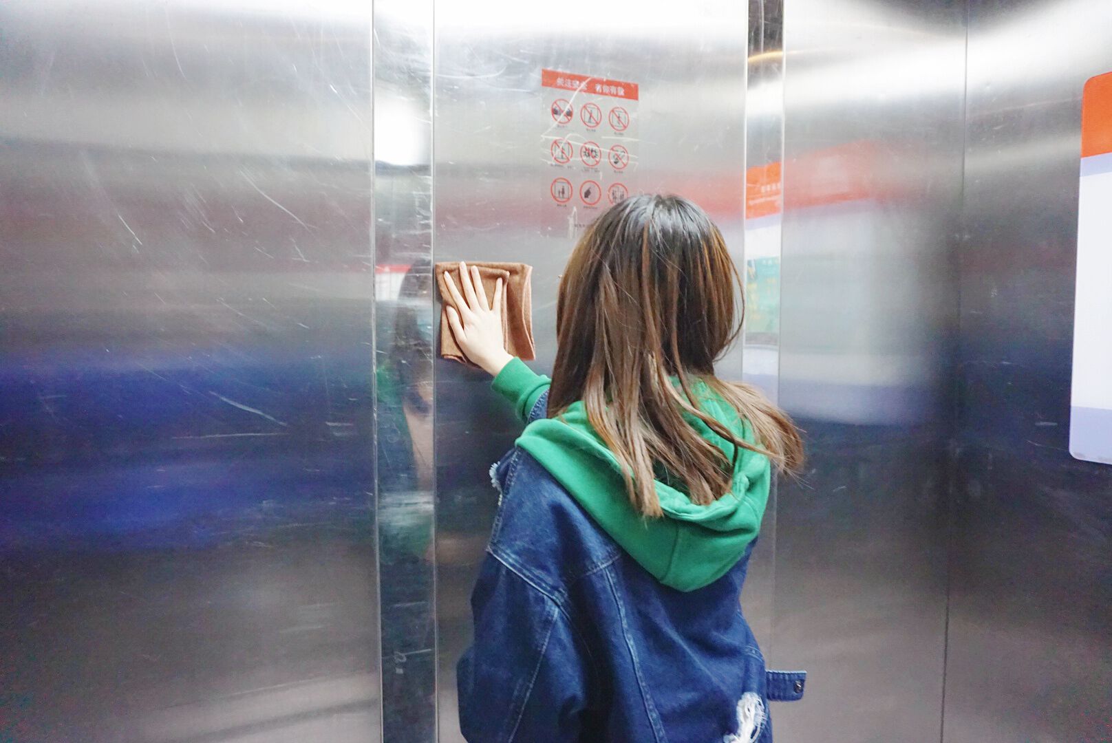 “需要按照同一方向匀速擦拭电梯轿厢,否则会留下斑驳的痕迹;而且电梯四面八方需‘面面俱到’,为了触达顶部还要通过凳子爬升至高处......”这是兰欣同学打扫电梯后的复盘总结,令她感到意外的是,电梯清洁不仅仅局限于扫洒和消毒工作,更重要的是定期涂抹保养油,进行润滑的同时也起到防止机械部件生锈的效果。