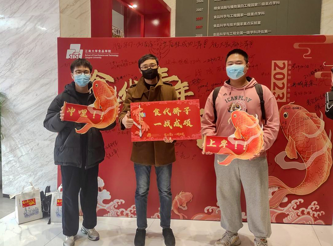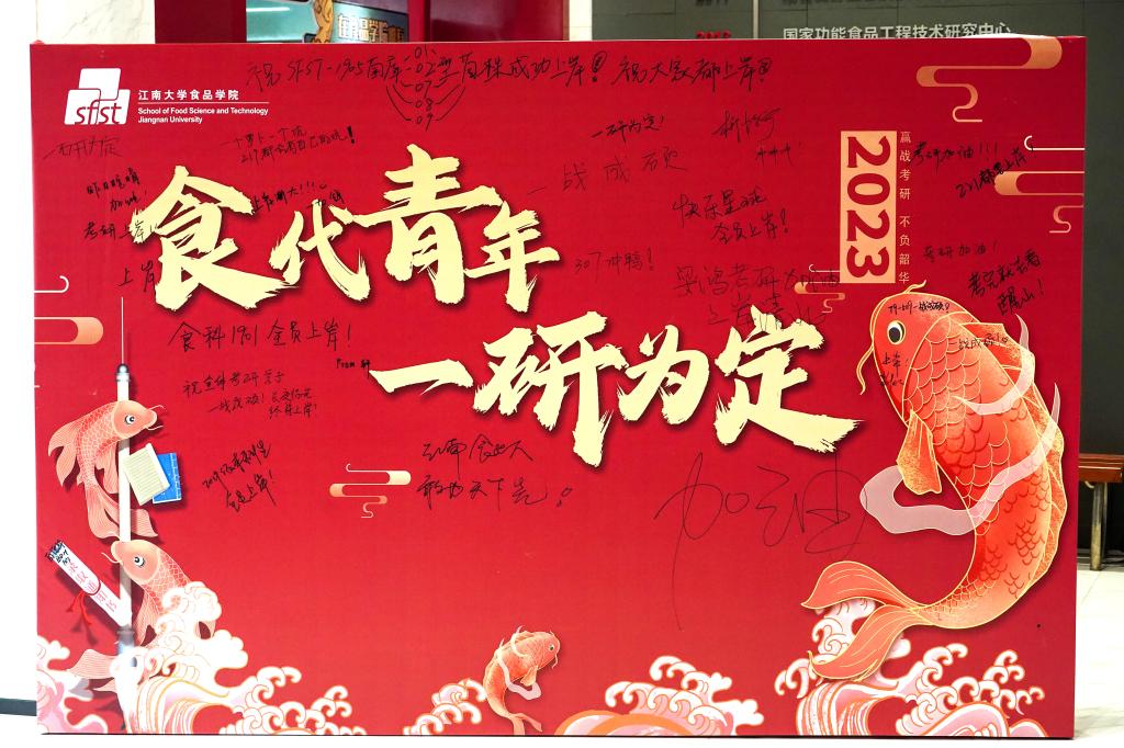 同学们驻足大屏幕前认真观看自命题试卷拆封教程视频,学习考试有关技巧,在“食代青年,一‘研’为定”签名墙上写下美好心愿,并手持加油牌与老师们合影留念。
