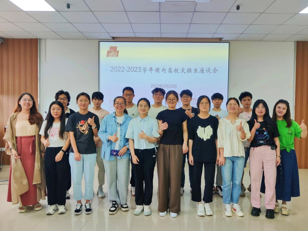 2022-2023学年国内高校交换生欢送会在D916会议室顺利举行。学院党委书记傅莉莉、分团委副书记李琳、2021级本科生辅导员曹敏,以及来自国内两所高校的15名交换生出席活动。