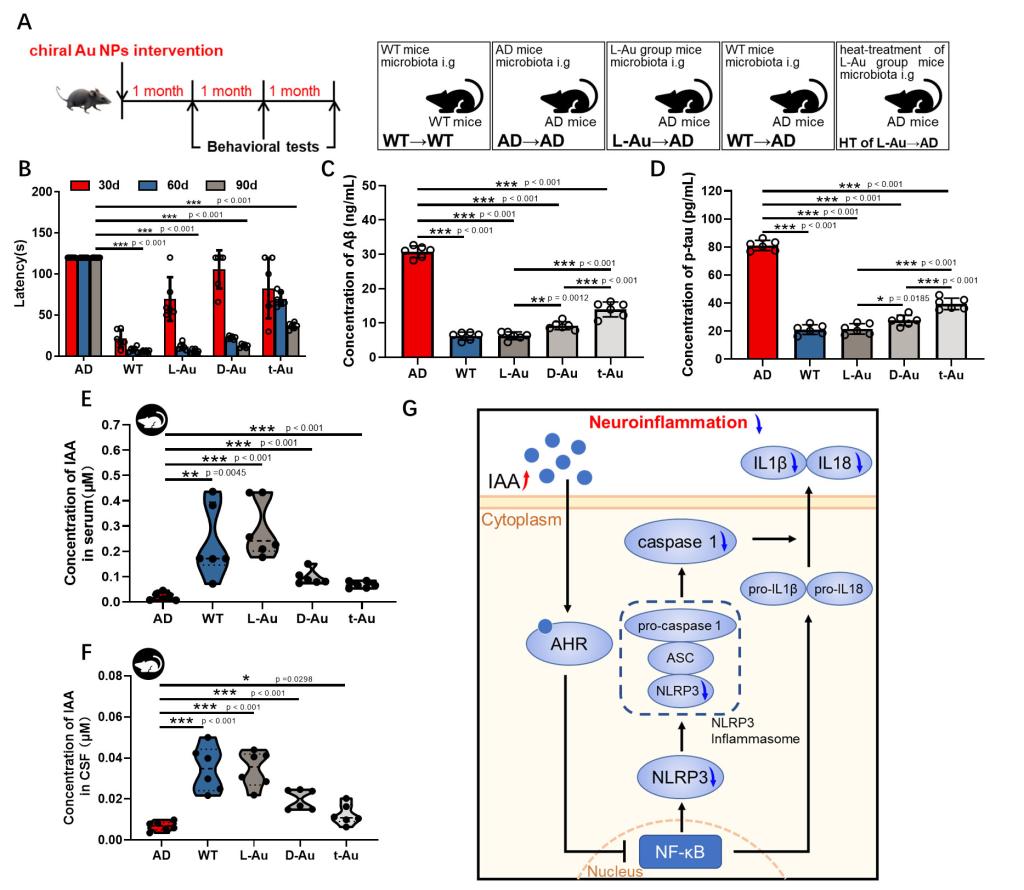 研究团队将治疗后小鼠的粪便移植到AD小鼠体内,发现粪便移植到疾病小鼠认知能力有效提升。微生物组学分析发现治疗后的小鼠肠道中乳杆菌属和梭菌属水平显著升高;血液代谢组学分析表明治疗后小鼠血清中代谢物吲哚乙酸含量大幅增加,临床检测发现AD患者血清和脑脊液中吲哚乙酸含量均低于年龄匹配的健康人。吲哚乙酸是色氨酸代谢途径中的重要中间产物,研究团队将同位素13C11标记的色氨酸单独或与手性颗粒一起口服,在小鼠血清中检测到了其代谢产物-13C10标记的吲哚乙酸,手性颗粒上调了乳杆菌属和梭菌属吲哚乙酸合成酶的表达,提升了13C11-色氨酸转化产生13C10-吲哚乙酸的水平。尤为重要的是,同位素标记的吲哚乙酸可以穿越血脑屏障进入到脑组织中。转录组学发现吲哚乙酸靶向脑中小胶质细胞和星形胶质细胞表面的芳烃受体,并通过转录因子NF-κB抑制炎症小体NLRP3,从而抑制神经炎症,改善了脑部的免疫微环境,恢复了神经元的功能。