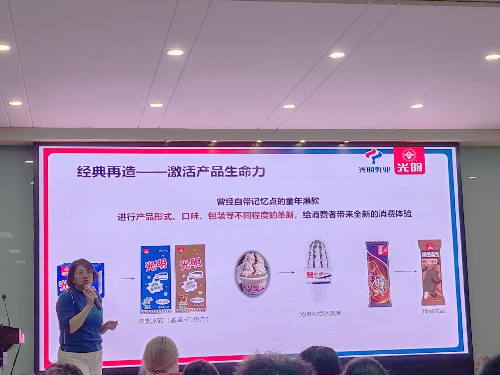 马中媛介绍企业概况。她的发言围绕光明乳业的发展进程、品牌建设、产品创新、产业愿景等多方面展开。她指出,“光明”是一个有温度的冷饮品牌,希望更多同学有机会参与到光明乳业的创新发展进程中。