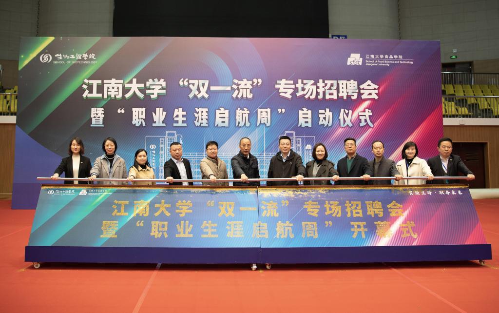 江南大学党委常委、统战部部长朱飞,无锡市人社局人才开发和对外合作处副处长吴莹,上海喜庆日供应链管理有限公司总经理吴琼,融媒体中心主任兼党委宣传部副部长胡振宇,团委书记魏珍吉,社会合作与校友联络处处长周云龙,就业指导中心主任兼学生工作处副处长单筱婷,教务处副处长吴宝锁,球友会