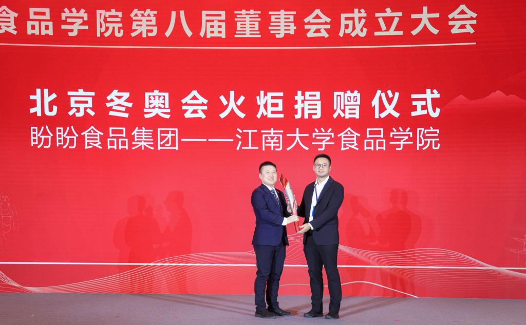 ”北京冬奥会火炬捐赠仪式。福建盼盼饮料有限公司总经理、伽那食品创始人蔡丕鹏向范大明捐赠火炬。