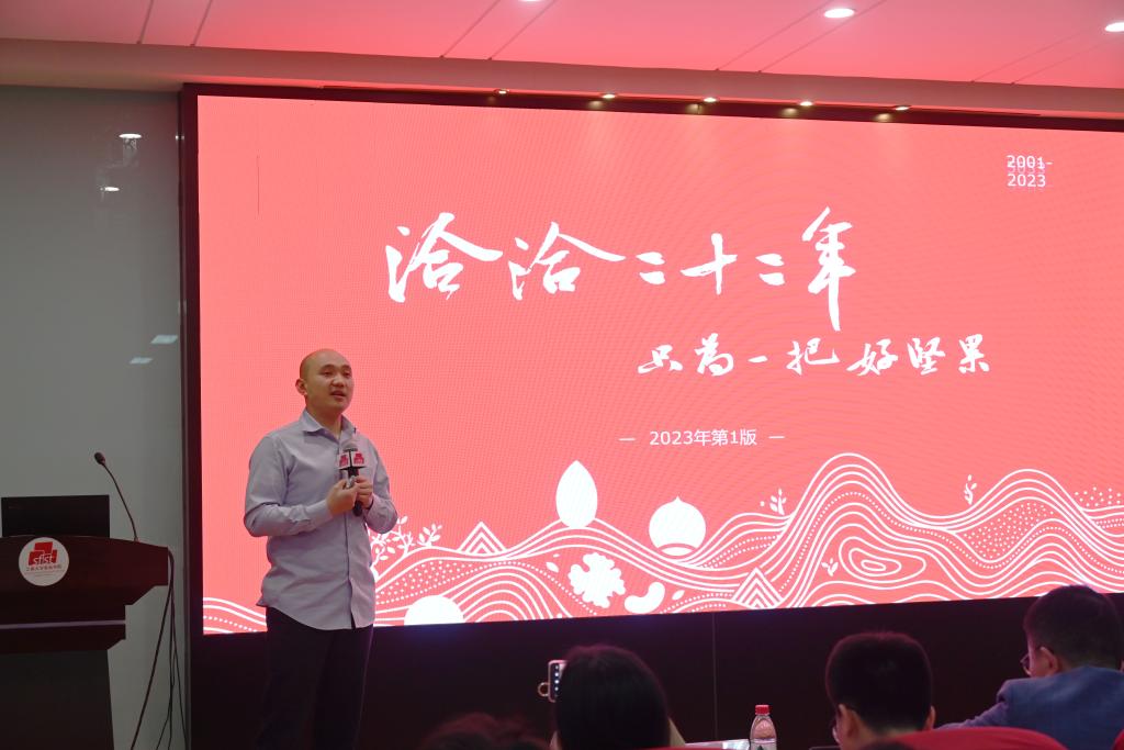 的合作过往,介绍洽洽的发展历程、球友会及核心优势,并围绕大赛主题、时间节点、评审要求、奖项设置等进行宣讲。他强调,本次大赛有助于实现产业与教育深度融合,促进同学们对食品行业更加深入了解,提升产品落地能力。
