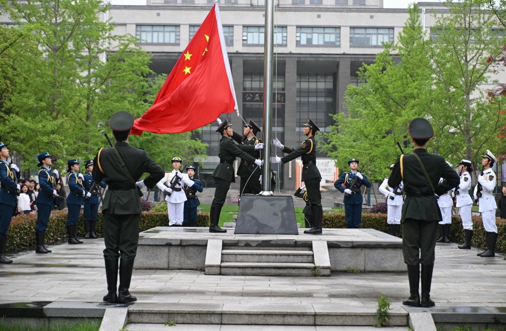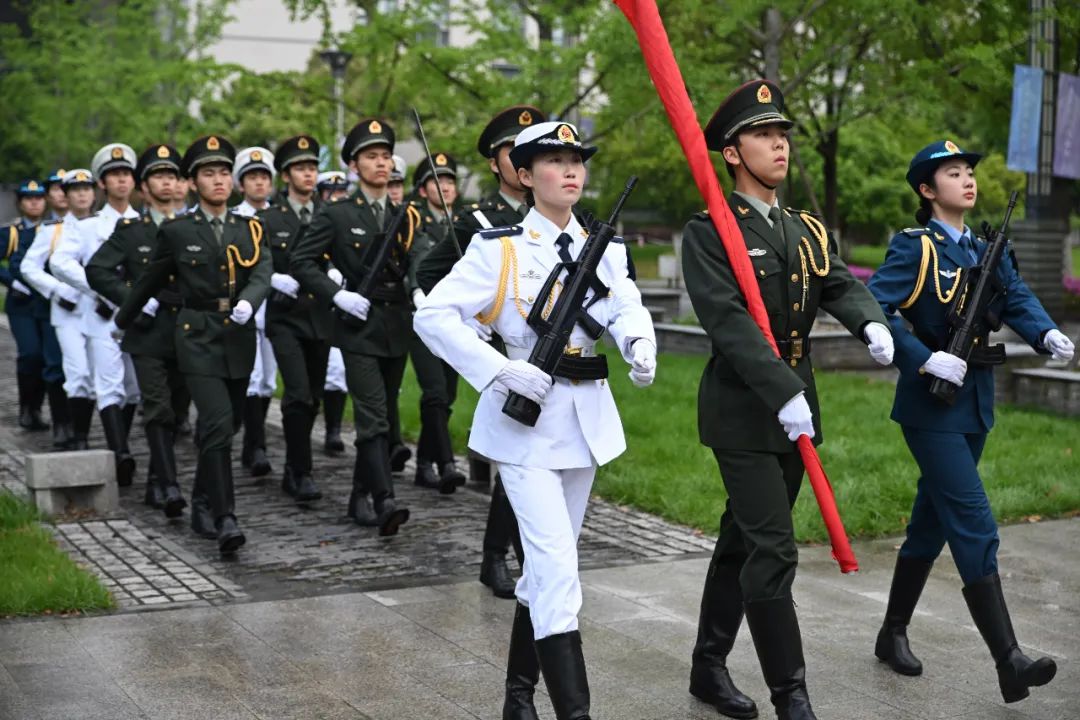 清晨7时,江南大学国旗护卫队队员们迈着整齐划一、铿锵有力的步伐,护送五星红旗正步走向旗杆。伴随着激昂的国歌响起,全体师生齐唱国歌,目送五星红旗冉冉升起,在熠熠晨光中迎风飘扬。