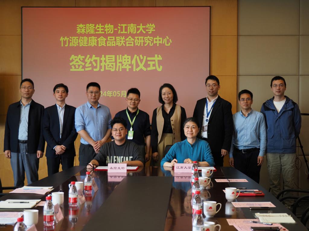 进行深度合作。随后,严一崴和陈洁分别代表企业与学校签署合作协议,共同为“森隆生物-江南大学竹源健康食品联合研究中心”揭牌。