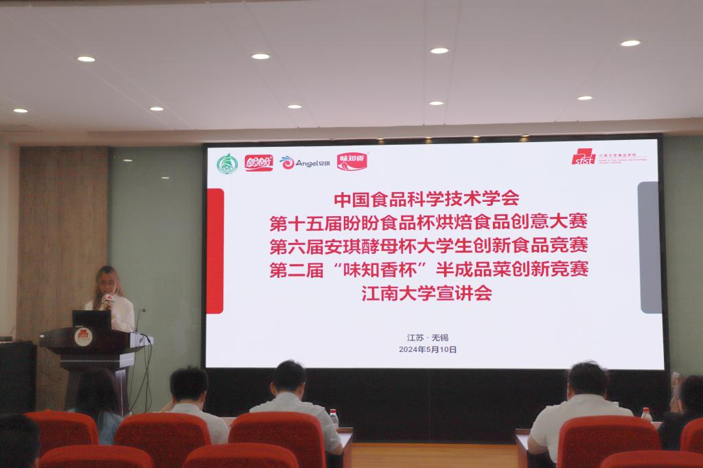 近日,第十五届“盼盼食品杯”烘培创意大赛、第六届“安琪酵母杯”大学生创新食品竞赛、第二届“味知香杯”半成品菜创新竞赛宣讲会在江南大学顺利举办。盼盼食品集团无锡区域经理刁益萍、区域主管董书芹,安琪酵母股份有限公司工程师陈颖雷、人力资源部招聘主管雷鸣,苏州市味知香食品股份有限公司招聘经理操洪涛,中国食品科学技术学会益生菌分会副秘书长、我校球友会
