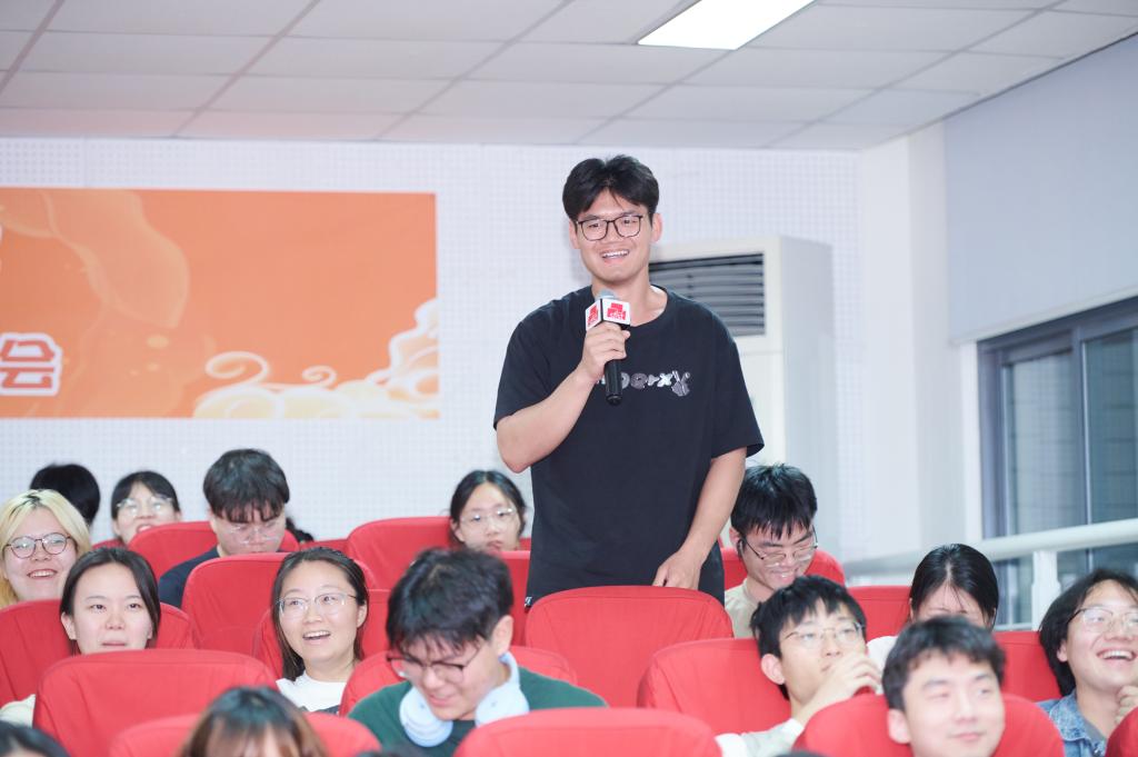 现场交流环节,同学们就创新大赛、实习实践、球友会等多个话题踊跃提问。到场企业嘉宾耐心作答,气氛十分热烈。