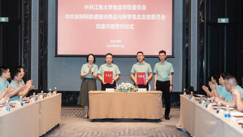 在随后举行的“结对共建”仪式上,双方就组织建设发展、党建业务深度融合,未来共建合作愿景等方面进行深入交流。李新华介绍东阿阿胶健康消费品与新零售党总支基本情况,以及与江南大学的合作经历。他指出,双方在产学研合作的基础上进一步发挥党建引领作用,旨在形成“共强党建、共享资源、共育产业、共惠民生”的良好格局。他希望双方通过党建共建把政治优势转化为制胜优势,在新征程中切实服务大国民生,助力经济腾飞。
