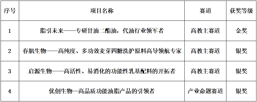 经过紧张激烈的现场角逐,江南大学食品学子以优异的表现斩获国赛金奖1项、银奖3项。其中,高教主赛道本科生创意组《脂引未来——专研甘油二酯油,代油行业领军者》荣获金奖;高教主赛道本科生创意组《春肌生物——高纯度、多功效麦芽四糖洗护原料高导领航专家》、高教主赛道研究生创意组《启源生物——高活性、易消化的功能性乳基配料的开拓者》、产业命题赛道产教协同创新组《优创生物—高品质功能油脂产品的引领者》等3个项目荣获银奖。
