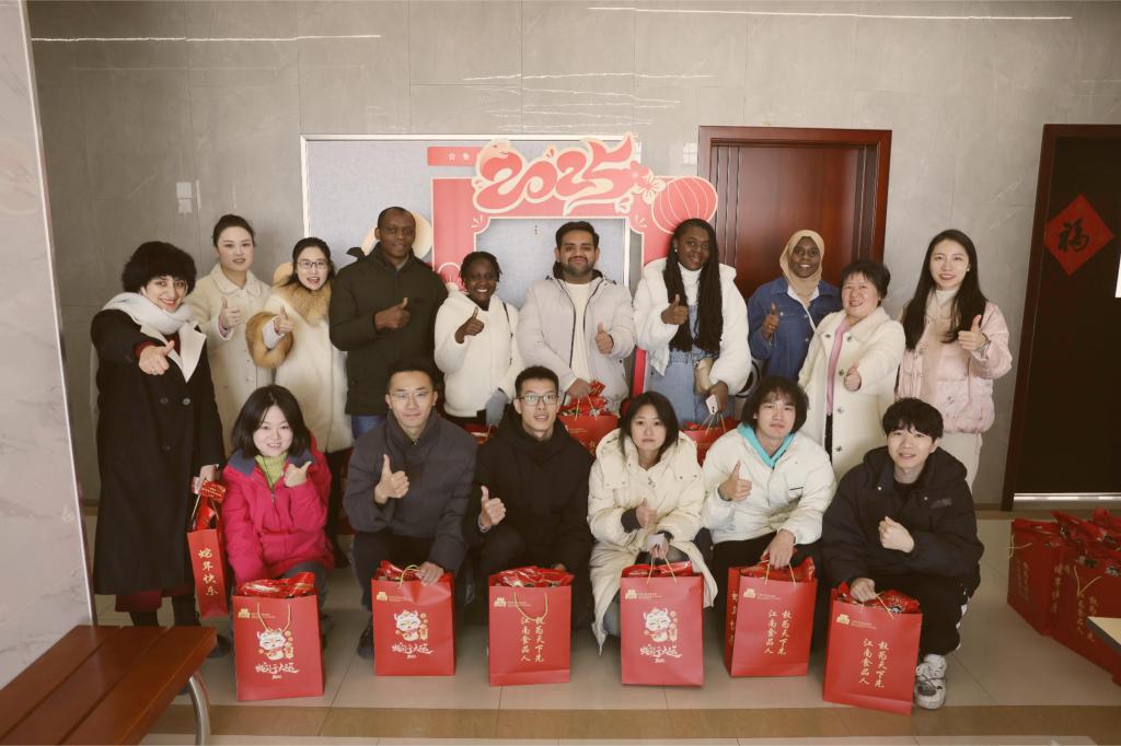 副院长孙秀兰、学工办副主任吴爽与研本辅导员为近百名留校过年的中外学子发放新春暖心大礼包,包括白象方便面、旺旺零食、学院文创等丰富的内容。礼包寄托了学院对每一名留校学子的深切关怀和新年祝福。老师们亲切鼓励大家在新的一年里继续努力,不断进步。活动现场还设置了“2025金蛇送福”主题背景以及学院吉祥物新春纪念拍照区。同学们踊跃参与,与可爱的吉祥物合影留念,用相机捕捉下这难忘的一刻,与远在家乡的亲人分享这份喜悦和温暖。