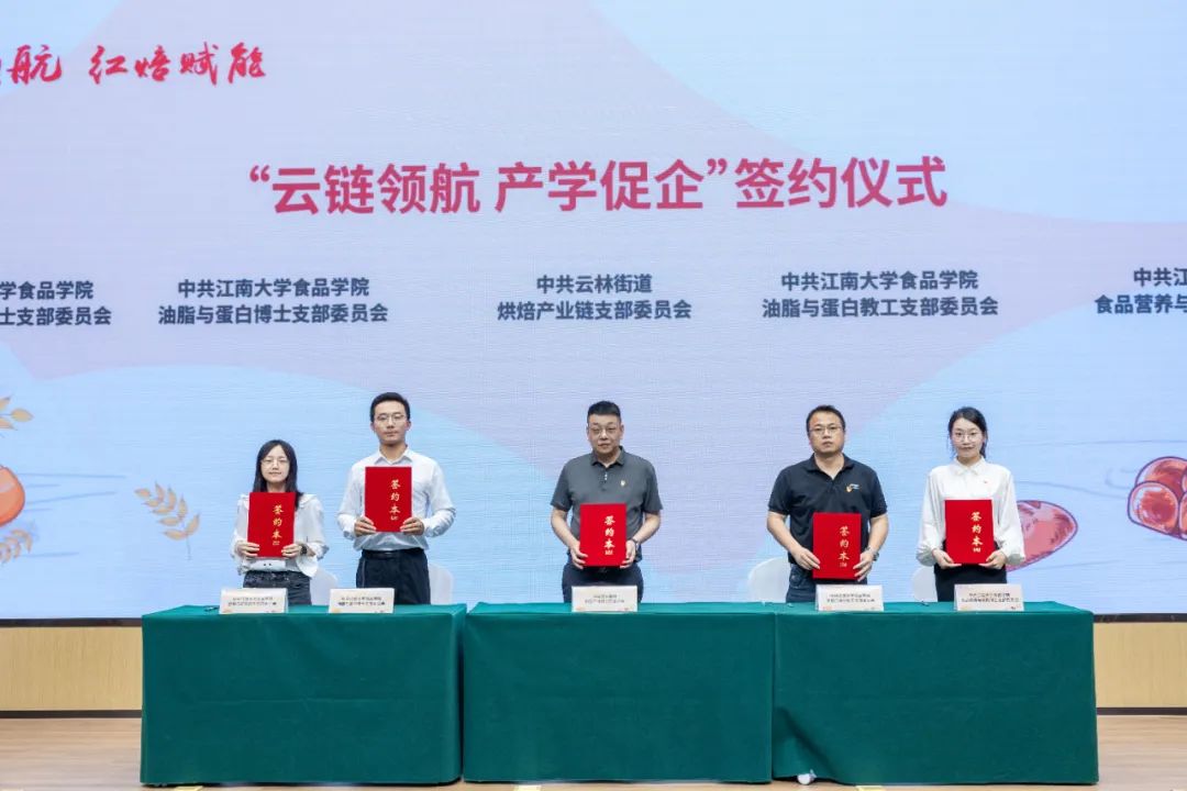活动现场,我校油脂与蛋白教工党支部、油脂与蛋白博士党支部、谷物与淀粉博士党支部以及食品营养与功能博士党支部,与云林街道烘焙产业链党支部、无锡市穆桂英美食广场有限责任公司党支部、区市场监督管理局开发区分局党支部、区委台办党支部、云林街道云津社区党总支、云林V-Park商圈党总支等多个基层党组织签署结对共建协议。通过这一合作,各方将进一步整合优质资源,加强在烘焙领域的产学研交流,深化校地企合作,共同推动食品产业向着更高水平进发。