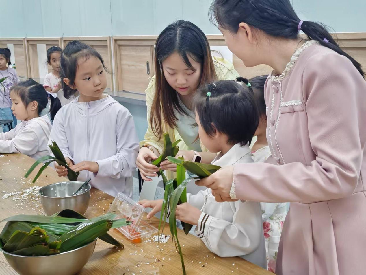 随后,备受期待的包粽子环节将现场气氛推向高潮。长桌上粽叶青翠堆叠,糯米、红豆、蜜枣、蛋黄等馅料琳琅满目。助教老师指尖翻飞,折叶成斗、填料压实、包裹成形、棉线缠绕——一个棱角分明的粽子诞生。“江小娃”们纷纷化身“包粽小当家”。尽管粽叶“调皮”、糯米“逃窜”,但在助教们手把手的耐心指导下,孩子们渐入佳境,甚至玩起了“创意粽”——改良外形、混搭馅料,童趣与智慧齐飞。现场粽叶沙沙,笑语盈盈,温馨满溢。