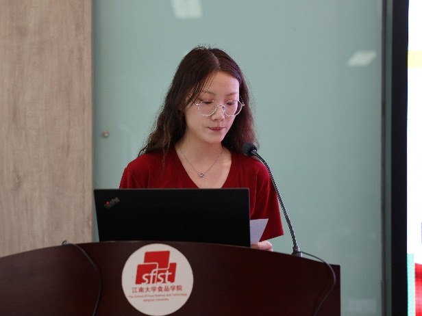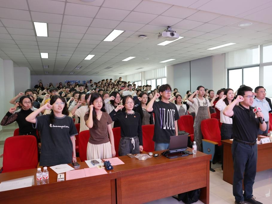D912报告厅主会场与D917分会场,300余名毕业生党员、新发展党员在学工办主任兼分团委书记李金杰的带领下庄严宣誓。铿锵誓言回荡会场,党员们眼神中闪烁着信仰的光芒。本科生第一党支部曾美怡作为新党员代表发言时表示,这是对政治生命的郑重宣告,更是对“为人民服务”宗旨的永恒承诺。熟悉的字句唤醒入党初心。“当右手握拳过肩时,实验室里‘求真务实’的精神与党旗下的誓言交叠,我更加明确了作为江南食品人的使命担当。”食硕2203党支部孟逸云作为毕业生党员代表发言如是说。