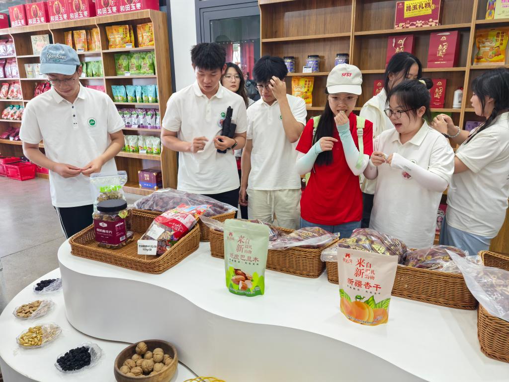 14日下午,队员们驱车前往224团5连,依次参观讲习所、家风家教馆以及铸牢中华民族共同体意识展示馆。当晚,实践团转赴农产品基地。调研并品尝红枣、巴旦木、葡萄干等果干,参观创意研发展品,如红枣创意咖啡、红枣普洱茶饮、枣肉苁蓉、枣雪菊等。夕阳余晖为戈壁滩镶上了金边,伴随着队员们的欢声笑语,这一天充实的社会实践活动圆满结束。