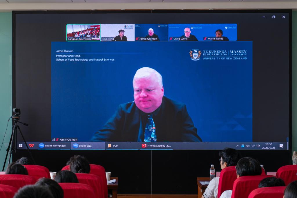 倪晔在致辞中向2025级国际班新生表示热烈祝贺与欢迎,向在线的梅西大学代表致以诚挚的问候。她勉励学子珍惜时光、笃学尚行,努力成长为具备国际视野与综合能力的食品科技人才,在全球舞台上展现江南学子的担当。Jamie Quinton在线致辞中强调,“3+1”联合培养模式旨在夯实学生的专业基础,并培养其以全球视角应对食品安全与营养健康等挑战的能力。