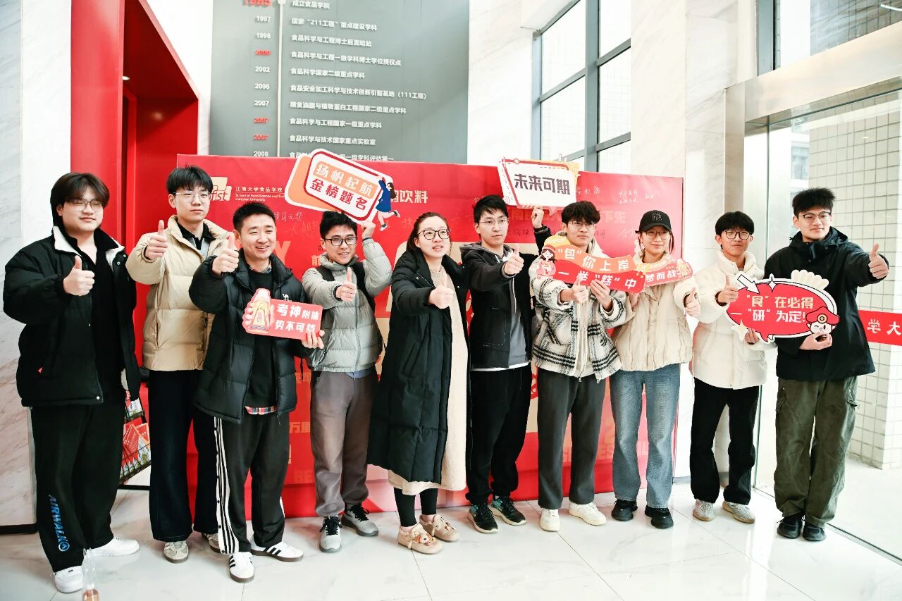 大厅入口处,“‘食’力满格,‘研’途必胜”主题展板格外亮眼。学子们纷纷驻足,执笔写下心中的滚烫心愿与奋斗誓言:“一战成硕,不负韶华”“全力以赴,奔赴理想”;也有同窗间的温情祝福:“愿我们顶峰相见”“一研为定,未来可期”。展板前的身影与笑容,共同拼贴出这个冬天最动人的青春画卷。