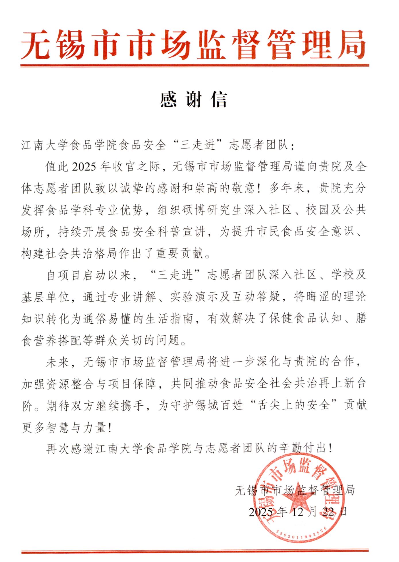 团队与无锡市市场监督管理局长期以来保持着紧密的合作关系。近日,市局特别向学院及全体志愿者团队发来感谢信,对双方在食品安全社会共治方面的协作成果给予充分肯定。感谢信是对我们双方携手服务社会、共建食安防线工作的生动注脚,也为未来的合作注入了更强的信心。展望新征程,希望球友会(QY)中国官方网站
