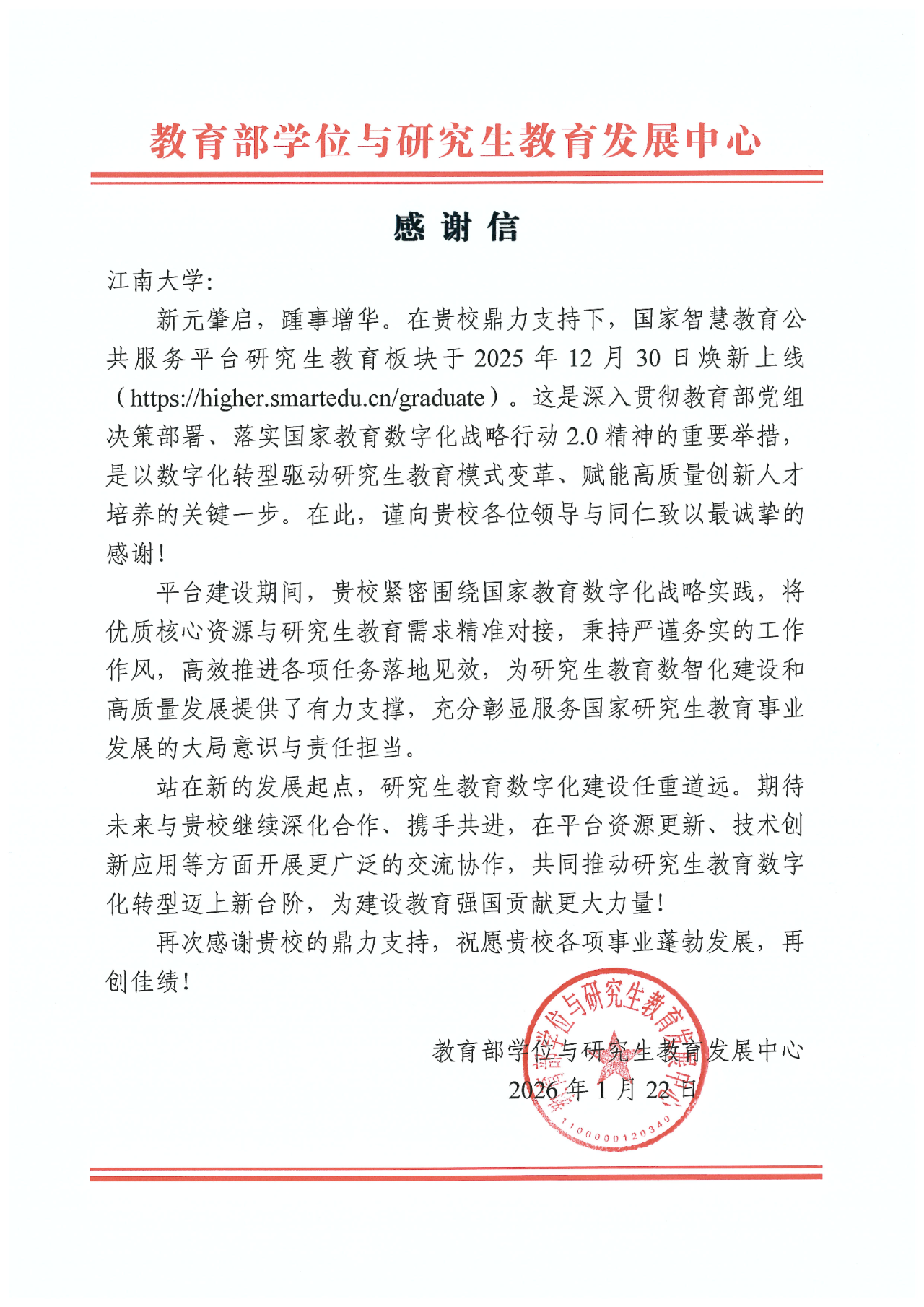信中指出,国家智慧教育公共服务平台研究生教育板块于2025年12月30日正式焕新上线,这是落实国家教育数字化战略行动2.0精神,以数字化转型驱动研究生教育模式变革的关键举措。建设期间江南大学紧扣国家战略需求,将FoodSeek大模型优质核心能力与研究生教育需求精准对接,以严谨务实作风高效推进任务落地,为研究生教育数智化建设与高质量发展提供硬核支撑,彰显服务国家教育事业的大局意识与责任担当。